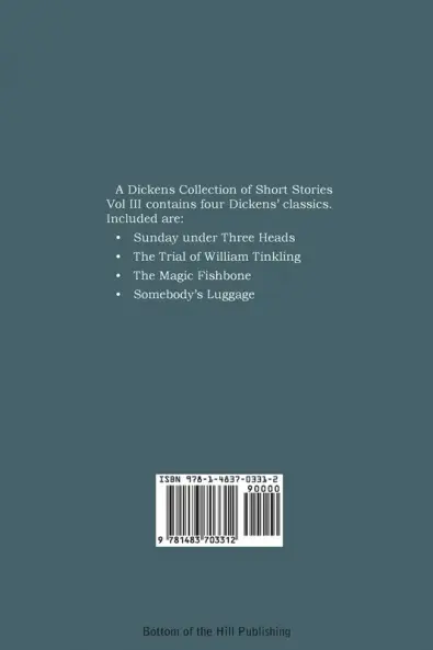 A Dickens Collection of Short Stories Vol III contains four Dickens’ classics. Included are Sunday under Three Heads The Trial of William Tinkling The Magic Fishbone Somebody’s Luggage.